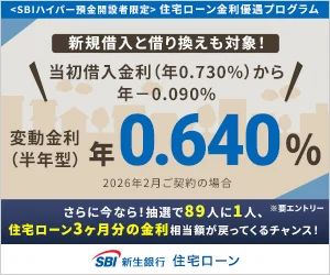 SBI新生銀行はネット銀行だからこその低金利が魅力。さらに「SBIハイパー預金」を開設している方限定で、変動金利(半年型)が年0.640%~になる金利優遇プログラムを実施中。預金口座開設は本審査の後でもOK!